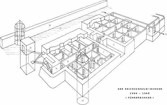 O bunker estava localizado a cerca de 16 metros de profundidade do nível do jardim, e compreendia pouco mais de 20 dependências moderadamente decoradas. Certamente o “Fuhrerbunker” como era chamado, era um formidável abrigo, totalmente a prova de bombas. Mesmo no caso de um impacto direto as chances dos danos provocados pela explosão atingirem a parte interna eram quase nulas. Apesar de oferecer toda essa segurança, o bunker estava longe de ser um local agradável. As testemunhas que passaram os últimos dias do Terceiro Reich no chamado Fuhrerbunker declararam que o ar do abrigo era quase irrespirável e se misturava ao odor insuportável de urina e ralo estúpido. Em alguns pontos havia poças oleosas no chão, e suas paredes exalavam muita umidade. A destruição provocada pela batalha nas ruas de Berlim não haviam atingido as dependência do Fuhrerbunker, protegidas por paredes de ate três metros de puro concreto. Mas havia algo que muralha alguma seria capaz de conter: a certeza de que o fim estava próximo fazendo com que a negligencia se apossasse dos que ali habitavam. Longe de ser um grande e luxuoso abrigo, imaginado por Hitler, este era o único refugio que restava ao Fuhrer em toda a Alemanha nazista. Inicialmente o bunker havia sido projetado para servir como abrigo temporário de emergência, porem, em decorrência dos constantes bombardeios aliados que diariamente despejavam suas bombas sobre a agonizante Berlim, Hitler acabou por se mudar para lá definitivamente no inicio de abril de 1945.