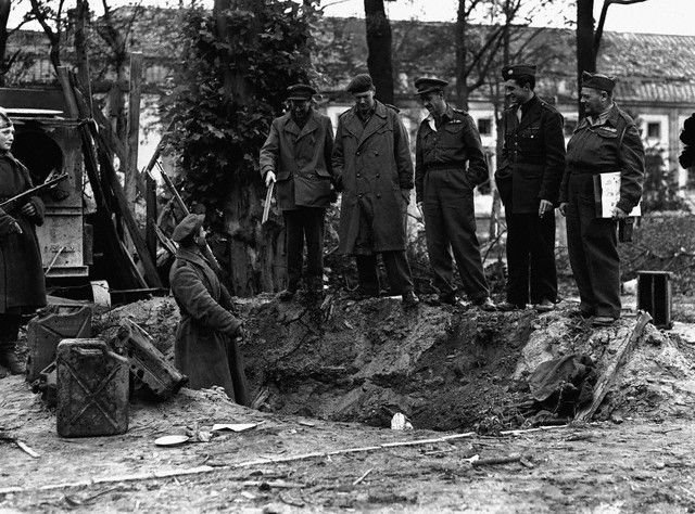 SOLDADOS SOVIETICOS MOSTRANDO A SOLDADOS INGLES O LOCAL ONDE O CORPO DE HITLER FOI ENCONTRADO. E POSSIVEL VER AS LATAS DE COMBUSTIVEL USADAS PARA QUEIMAR OS CORPOS.